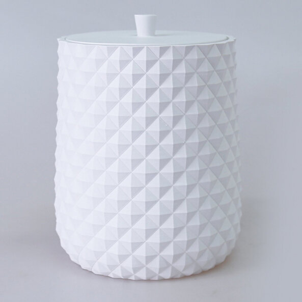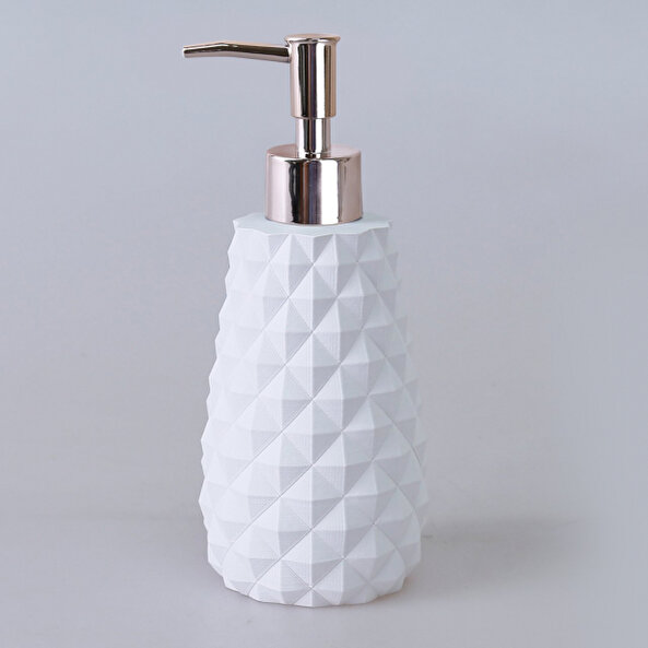 Üçgen kabarık dokusu olan, modern tarzda tasarlanmış silindir şekilli formdaki bu banyo setine gümüş rengi dinamik bir görünüm verir.